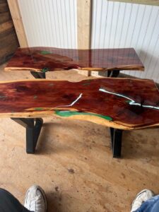 For a bold and artistic statement, choose to add a custom epoxy river in the color of your choice. Flowing through the center of the table, the epoxy accent highlights the unique contours of the wood while creating a modern yet organic look.